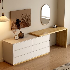 This is a dressing table set that combines practicality and aesthetics. It can be stretched and placed at corners, suitable for different house layouts and spaces. With six large drawers, it can easily store cosmetics, sundries, etc. The simple lines and natural wood color allow it to blend into various home decoration styles such as modern and Nordic.