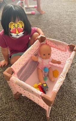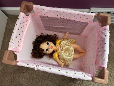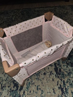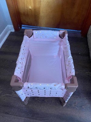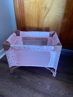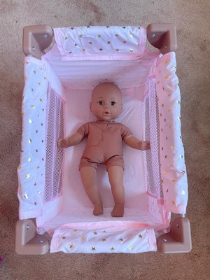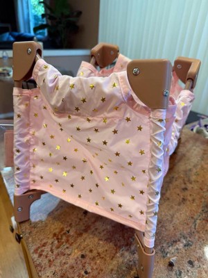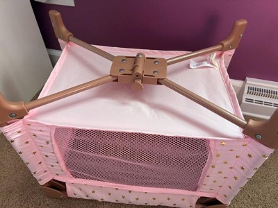 [This review was collected as part of a promotion.] This doll playpen is absolutely adorable! The pink and rosy brown and gold colors are so cute. It's easy to setup and fold up to put away, but takes up very little space. Seems very durable as my 3 year old was sitting in it at one point. I think our Bitty Baby doll is a bit snug in the crib but my daughter doesn't notice.