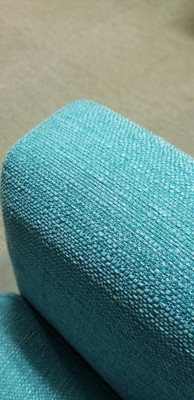 Wow, this is a looker and high quality, sturdy, dense and well made. Fabric is great and very strong. Teal color beautiful. Only minor thing is holes at bottom of chair to screw in legs look a bit sloppy when they drilled them but it did not hinder putting the screws in correctly & tightly. I used a flashlight to align leg holes to holes on bottom of chair to screw them in correctly.