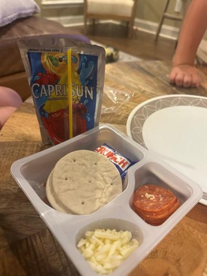 - Contains pizza crust, pizza sauce, pepperoni, mozzarella pasteurized prepared cheese product, Capri Sun Fruit Punch Flavored Juice Drink Blend from concentrate and Crunch milk chocolate with crisped rice bar