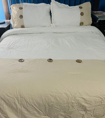 [This review was collected as part of a promotion.] I am so happy with this bedding set. I love the neutral off white which will match any decor. It fit perfectly on my queen size bed. I also really liked the large button accents which compliment my farmhouse decor perfectly.