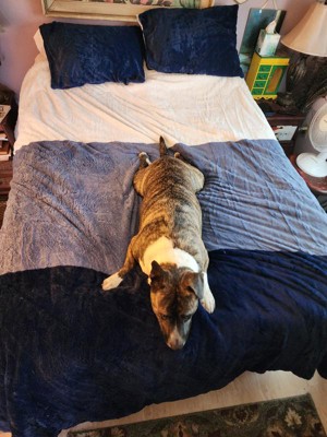 [This review was collected as part of a promotion.] i picked this up just because of the colors and did not even pay attention to it being a furry style comforter but wow was i surprised when i pulled it out, it is so soft and furry, it feels like you are covering up with a giant kitten, really soft and very warm, we ended up turning it around backwards so that the furry side is the under side and the dark navy is the top side and it made a huge difference in the warmth using it that way, now if i can just keep it on the bed as every time i turn around the wife has it and is all wrapped up in it, sitting on the couch watching tv, or sitting at her computer and she has the blanket all wrapped around her. i will recommend this to anyone that likes the very soft furry style covers, as a matter of fact we have done ordered a second one that way maybe i can keep one on the bed...
