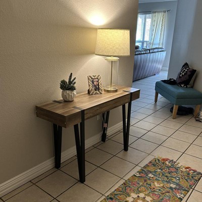 This modern farmhouse-inspired console table brings character to your living room, entryway, hallway, or small den. Its rectangular design is crafted from high-quality manufactured wood with a beautiful oak finish and contrasting black legs and is made to last for years to come. The oak finish wood grain highlights its natural characteristics (knots and all) and is sure to complement just about any color palette. The narrow yet spacious tabletop lends itself to meet many needs - from an entrance table to place your keys and bag to a sofa table to place your favorite lamp and display your family photos. The console table arrives ready to be assembled with instructions and hardware included..