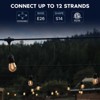 Luxrite LED Outdoor String Lights - Transform your outdoor space with our 48-foot string lights, featuring 24 hanging sockets adorned with shatterproof S14 Edison LED bulbs that emit a warm gentle glow. The distance between each bulb is 2 feet and they each hang down 6.13 inches from the cable. These lights withstand changing seasons with commercial-grade, weather-resistant construction. ETL listed and IP65 waterproof, they defy rain, snow, and high temperatures making it deal for gardens, yards, balconies, pergolas, and more. Connect up to 12 strands for 576 feet of continuous illumination, with an 8-inch female end and 15-inch male end. Easy to install with hooks on each bulb location, customize the slack between bulbs for a personalized ambiance. Low-watt bulbs ensure energy efficiency, and with IP65 wet rating, 120V plug-in compatibility, 24 hanging E26 sockets, and a 1-year warranty, these lights offer durability and style for your exterior space, providing a charming, year-round outdoor haven.