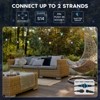 Luxrite RGBW LED Outdoor String Lights - Elevate your outdoor ambiance with RGB string lights that offer 8 vibrant colors and 8 dynamic modes, effortlessly transitioning from a romantic to a playful setting. Complement your outdoor decor with beautiful colored string lights featuring 24 hanging sockets and shatterproof S14 LED bulbs, creating the perfect ambiance. Adjust these color-changing outdoor string lights with the included remote or on the outlet plug for added convenience. Suitable for holidays, events, or enhancing your garden, yard, pergola, gazebo, porch, deck, or patio. Designed to endure changing seasons and harsh weather conditions with an IP65 wet rating, these lights withstand rain, snow, wind, and high temperatures. With easy setup using included hooks, customize the slack between bulbs for a personalized experience, whether hanging straight or swaying. Enjoy an end-to-end connection with up to 2 strands, providing 96FT of continuous light. These 48-foot outdoor hanging lights are remote-controlled with 8 colors (red, green, blue, light blue, orange, purple, warm white) and 8 modes (multi, strobe, twinkle, fade, breathe, flash, auto, random), dimmable, plug-in rated, come with 2 extra bulbs, and come with a 1-year warranty.