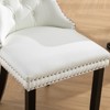 These dining chairs feature a modern,high-end design with elegant upholstery that combines the artfully shaped back.The sophisticated look is enhanced by handcrafted decorative nailhead trim,adding a distinct and refined detail.Engineered for long-term comfort,the seat cushion utilizes a triple elastic structure of high-rebound sponge,rubber bands,and steel springs.Built with sturdy solid wood legs,the chairs are offered as a convenient two-piece set,perfectly blending style with durability.