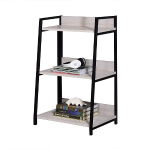 This bookshelf combines an industrial chic design with a versatile leaning-ladder silhouette.It is constructed with a sturdy and robust frame that ensures reliable stability and durable support for your belongings.The bookshelf features natural wood shelves that add warm texture and organic contrast to its overall aesthetic.It provides spacious open storage with multiple compartments for accessible and stylish organization of items.