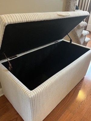 The storage bench concept isn’t exactly brand new, but the quality of this bench is something to talk about! It’s surprisingly lightweight-yet-sturdy while it’s empty; even with some back issues I was able to pick this up no problem. As a 225lb guy, I was able to sit on top of the lid and the piece totally felt like it was supporting me! It’s pretty spacious on the inside, and I like that the front has a handle to mitigate the risk of getting greasy hands all over the fabric. There aren’t really any drawbacks, but there are two things I wish it had: handles on the sides to move the bench easily, and I wish the top opened up all the way. Overall, this is a stylish, quality piece and I’m really happy with it!
