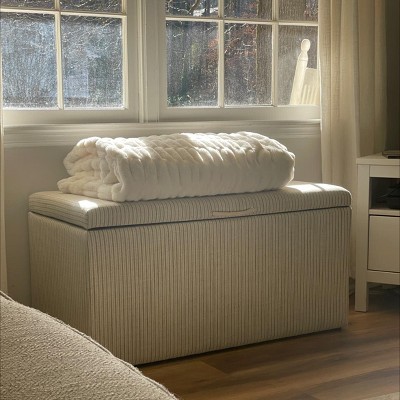 This is a beautiful storage bench. The typical quality you expect from Target. It has a rope handle on the front, and the material is very soft. The inside is a black felt like material but not incredibly thin. It’s easy to open and move around, isn’t super heavy. Thinking to get another for my kids room as it won’t smash little hands without force.
