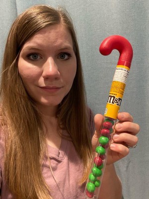 [This review was collected as part of a promotion.] Absolutely love the candy cane shaped packaging that these peanut M&Ms came in. They are perfect to slip into a stocking or top a gift off. The M&Ms taste great and are fresh in this vessel. Love these for Hollidays!