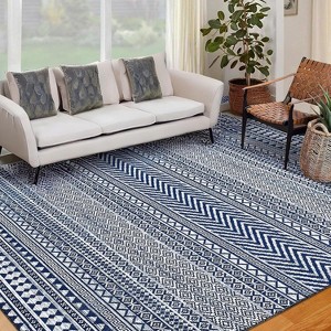 With a stylish and neutral Moroccan-inspired design, this 5' x 7' navy blue area rug adds a modern and chic touch to your space. Its versatile look makes it easy to coordinate with other decor, and it's sure to enhance the overall aesthetic of your home. Our moroccan geometric rug has an anti-slip bottom, which means that it will stay securely in place and prevent any accidents or slips. Our carpet is easily cleaned and maintained. You can wash the rugs in a regular washing machine, eliminating the need for special cleaning supplies or equipment.
