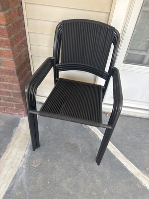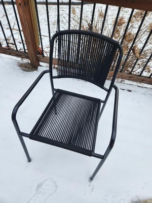 Bring stylish seating to your outdoor space with this Mackworth Outdoor Patio Seating Collection from Threshold™. This thoughtfully curated outdoor collection features a patio statement chair, loveseat, stackable patio chair and two outdoor patio chairs. The black metal frame with a black rope-wrapped design offers an artisanal vibe, while protective weather-resistant qualities offer worry-free, lasting outdoor use. Plus, padded seat and back cushions offer enhanced seating and statement style.