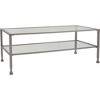 Make an understated design statement in your living room with this sleek, contemporary coffee table. Crafted with a sturdy metal frame and two shatter-resistant tempered glass shelves, this coffee table provides ample space to serve snacks or display books and potted plants. Its open-tiered design gives a minimalist look, while its distressed metal frame adds weathered charm.