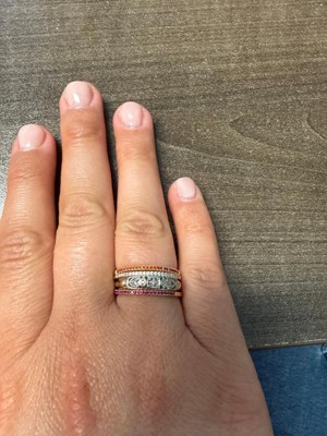 [This review was collected as part of a promotion.] Delicate ring. The gems are bright. Wish these came in 1/2 sizes. I wear a 5 1/2 ring and ordered size 6, it spins around and quite loose, but the ring it’s stacked with can hold it in place.