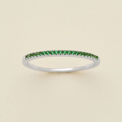 The green of these stones is very bright—keep it in mind if you like a deeper emerald stone. I absolutely adore it because I like to pair it with two other birthstone rings. Very thing band so it stacks extremely well with others.