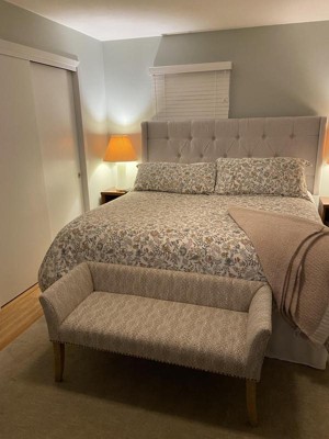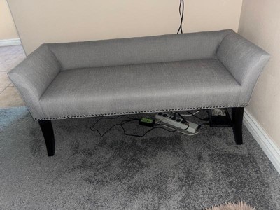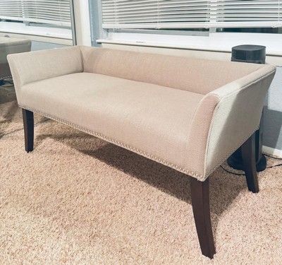 [This review was collected as part of a promotion.] This Madison Park Welburn Accent Bench is beautiful! Really nice and sturdy, with a firm cushion seat. The grey fabric is durable and has a pretty grommet trim at the edge. This is a high-quality, comfortable, functional entryway piece in my home. Assembly was a breeze. The only thing to affix to the cushion top were the legs of the bench. Size wise, one person fits with ample room, but two could sit on it if needed. I’m super happy with it!