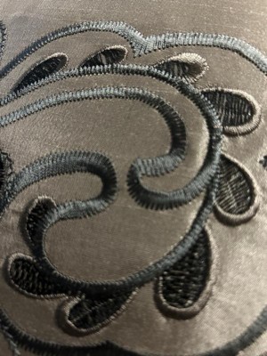 - Decorative pillows have embroidery and pleating details