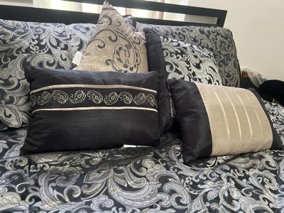 The Madison Park Essentials Brystol 24 Piece Room in a Bag provides a total makeover for your bedroom decor. This traditional comforter flaunts a jacquard paisley pattern with an accenting solid border to create a luxurious glam look. Matching pillow shams and solid Euro shams with 2-inch flanges coordinate beautifully with the elegant comforter. A solid bed skirt and 4 decorative pillows with embroidery and pleating details add the finishing touches to this paisley bedding set. Hypoallergenic polyester filling in the comforter and pillows contains no allergens and is treated to be dustproof. A 4 Piece sheet set is also included to complement the comforter and complete the jacquard bedding set. To elevate your bedroom, 4 solid window curtains with 2 paisley valances and 2 solid tiebacks are included to perfectly style your windows. Machine washable for easy care, this paisley comforter set may come in rolled or compressed packing and will need to be fluffed up. Use a steam iron to help remove wrinkles easier. Spot clean pillows.