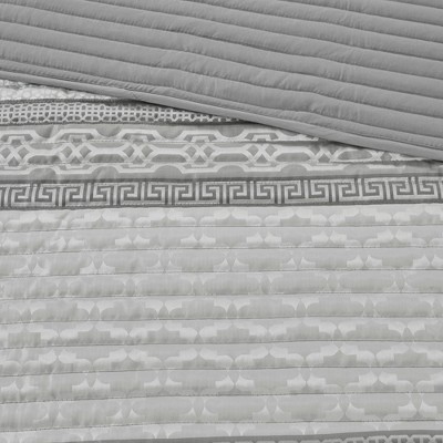 Madison Park William 4 Piece Reversible Jacquard Quilt Set offers a touch of glam for your bedroom. This jacquard quilt set features a woven stripe motif in shades of gray and white for a luxurious transitional allure. The solid gray reverse complements the top of the bed, while two matching shams mirror the design of the quilt creating a sharp coordinated look. A square decorative pillow provides the finishing touch to the jacquard quilt cover set. This jacquard quilt set is machine washable for easy care. Items in the set may come in a rolled or compressed packaging, which will need to be fluffed up or steam ironed before use to remove wrinkles.