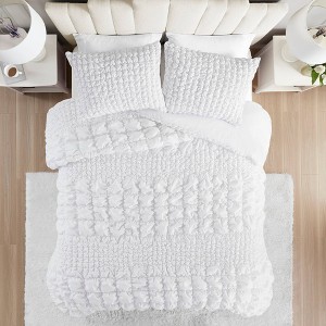 This Madison Park Josie shabby chic cottage style comforter set features elastic embroidery creating both small and large square shaped ruching, giving the bedding set a stylish puffy appearance. Also included are two matching shams featuring small ruching to complete the look. Available in multiple colors: soft white and warm grey.