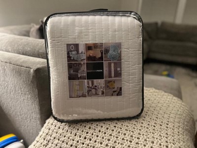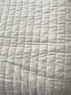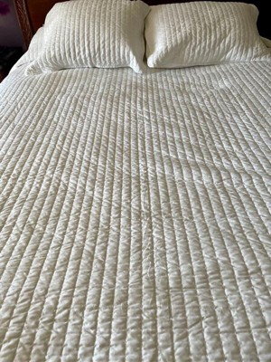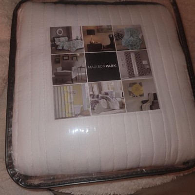 [This review was collected as part of a promotion.] I received this product for free from Madison Park in exchange for my honest review. I got this in the queen size and it fits our bed really nicely. It is solid white and has a striped quilt pattern on both sides of the quilt and the front of the pillow shams. It's not thick, so it can be used year round. This feels really soft with a cotton/poly/rayon blend (90%, 8.1%, 1.9%), but with that blend, I do think quality is forsaken. The material is stark white and thinner than our usual quilts. The pillow shams aren't quilted on the back side, which which makes the back side of the pillows not entirely opaque, as I showed in one of the pictures. The pillow shams fit nicely, but again, they're not opaque on the opposite side. Overall, the quilt is nice, but the pillow shams make it feel on the cheaper side. I think we'll use it in our guest room because I don't think it would last more than a couple of years as an everyday quilt.