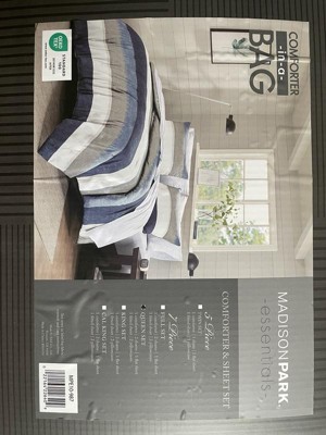 Madison Park Essentials Jaxon Stripe Comforter Set with Bed Sheets Twin Aqua/Grey Revamp your bedroom style with the Madison Park Essentials Jaxon bed in a bag. This modern comforter set features a stripe pattern in alternating grey, navy, and blue colors
