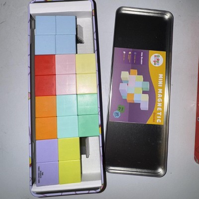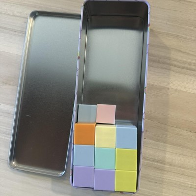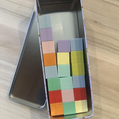 These are cute and fun, but giving 3 stars because the metal box is way bigger than the blocks inside. More than half of the tin is empty. This should be right sized - add more blocks or make the tin smaller. It’s a little misleading when purchasing and Moms don’t have the space to be carrying around extra air!