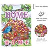 - Features the phrase, "Home Sweet Home" in trendy font around a brightly colored and floral decorated birdhouse