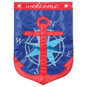 This garden flag by Magnolia Garden is designed with a combination of fabric appliques and exquisitely detailed embroidery on both the front and back; Flagpole sold separately. Features the word, "Welcome" in trendy font on the top red border, above a large red nautical anchor overlaying a compass rose in light blue on a deeper blue background; The bottom edge of the flag is shaped to match the anchor. Made of quality polyester double thickness material; These flags are heavier than most others on the market and will hold up for longer, They will retain its color and beauty for years if displayed in shade or semi-shade, and is rainproof; Measures approximately 13 inches wide and 18 inches tall. Perfect for displaying in a garden, on its own or as part of a garden display year-round; Fits most standard garden poles, sold separately; Care Instructions: Handwash in cold water, Air dry with no heat. Contained in protective packaging; Ready for easy gifting for a housewarming, birthday, or any special occasion