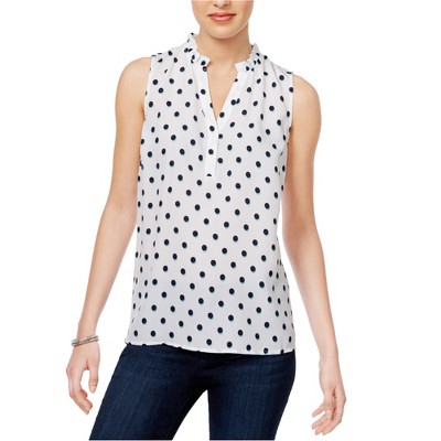 Effortlessly transition from desk to dinner in this chic maison Jules shell blouse. Designed with a playful polka-dot pattern and a sophisticated ruffle-neckline, this sleeveless top adds a touch of modern flair to any ensemble. The split neckline, featuring two delicate buttons at the bottom, offers a subtle hint of detail that elevates this classic fit piece. Imagine yourself radiating confidence as you move through your day, this blouse offering the perfect blend of comfort and style for all your casual occasions. Crafted for a confident stride, this blouse promises a medium-weight feel and opaque coverage, ensuring you look and feel your best. Its classic fit drapes beautifully, making it a versatile addition to your wardrobe. Whether you're meeting friends for brunch or heading out for a casual evening, this polka-dot shell is your go-to for a look that's both fun and fashionable.