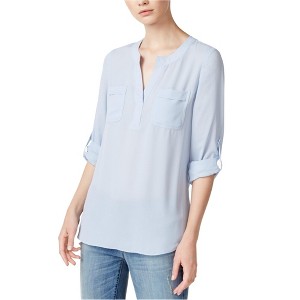 Additional Details: Elegant solid pullover blouse Split neckline Two chest patch pockets Long sleeve with roll tab
