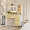 - 【Ample & Soft-Close Storage】 Four fabric-lined drawers and multiple open shelves; Keep cosmetics, jewelry, skincare, and hairstyling tools neatly organized and accessible.