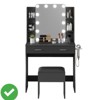12 Bright LED Lights & Large Mirror ¨C Surrounded by 12 LED bulbs, the vanity mirror provides bright, even lighting for smooth makeup application and hairstyling at any time of day. Makeup Vanity Desk with Mirror and 12 LED Lights, Vanity Table with Power Outlet, 2 Drawers 6 Shelves, Hair Dryer Holder & Stool, Modern Dressing Table Furniture with Storage for Bedroom.