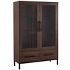 This sophisticated display cabinet combines tempered glass panels with sturdy MDF construction and sleek metal legs, offering a refined way to showcase collectibles or decor. Featuring 4 adjustable glass shelves and two spacious drawers, it provides versatile storage while maintaining a clean, contemporary aesthetic.