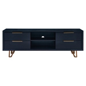 Sleek media storage. An entertainment center to top all, place your wall mounted TV above this glam media stand. Ebony finish with antique brass handles creates an elegant look, while four drawers hide away games, and two open shelves display decoritems. Elongate your living space with this chic TV stand optimizing your home with storage and .