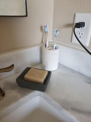 This toothbrush holder is heavy and looks more expensive than the price I paid. I had originally planned to purchase a more expensive one at a designer store but saw this one in Target and grabbed it. Definitely a buy.