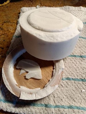 - White mortar bowl with brown base and white pestle