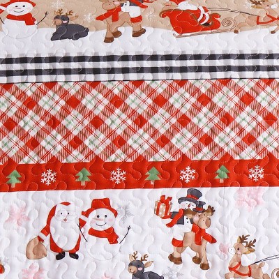 This Christmas quilt set is a delightful blend of festive charm and comfort. It showcases a playful pattern with Santa Claus, snowmen, reindeer, and Christmas trees across a backdrop of red - and - white checkered and striped sections. The set includes a quilt and matching pillow shams. Made from soft fabric, it's perfect for adding a fun - filled, holiday spirit to your bedroom.