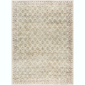 Welcome to the Rainier Collection, a unique collaboration between PNW Home x Livabliss that brings an updated traditional style into your living space. This stunning area rug captivates with its vintage geometric pattern and earthy colors of green and brown, elegantly edged in off-white and pearl. Born in Turkey through machine-woven construction, it is composed of durable polyester, promising longevity even in high-traffic areas. For your convenience, this no-pile rug is effortlessly maintained - just pop it into the washing machine on a cold delicate cycle with non-chlorine bleach only and line dry. To enhance its lifespan and comfort underfoot, we recommend using it with a rug pad.