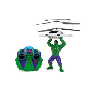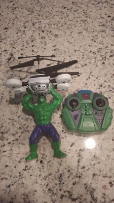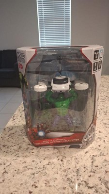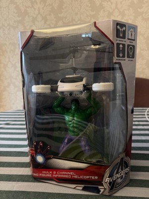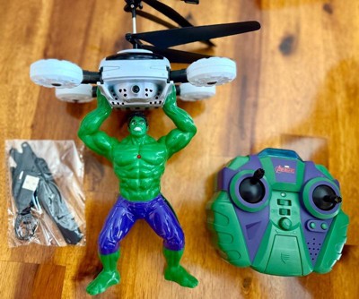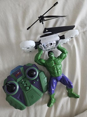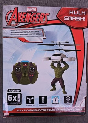 Grab on to that drone before it gets away! Smash your way through the chaos with the Marvel Licensed Avengers Hulk 2CH IR RC Helicopter. Join the rampage against the enemy flying this RC Helicopter with 3 distinct Heroic Action Phrases like HULK SMASH! With 2 channel control and infrared technology flying is simple and straight forward. It's also RTF (Ready To Fly) out of the box, just put 6 AA batteries in the remote control and take off. Assemble the Avengers and get ready to smash and save the world with the Marvel Licensed Avengers Hulk 2CH IR RC Helicopter!Features: Officially Licensed by Marvel Comics Features 3 Variant Heroic Action Phrases Twin Rotors for Stability and Control Ready To FlyIncludes: Marvel Licensed Avengers Hulk 2CH IR RC Helicopter IR TransmitterBattery Requirements: Vehicle: Internal LiPo Battery (Included) Transmitter: 8 AA Batteries (Not Included)Product Manual:DownloadCheck out our giant selection of Officially Licensed Marvel products! Marvel Helicopters Marvel Drones Marvel UFO Balls