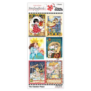This exciting series of stickers is called Classics, because it showcases the best loved art drawn by Mary Engelbreit. Some of these well loved images haven't been seen for years. The first sheet, entitled Peace, brings to mind peace, love and joy.