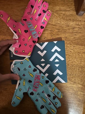 [This review was collected as part of a promotion.] I picked up the Game Over Era 9.0s Limited Edition football gloves for my son and he really likes them. The bright blue and pink on the palm stand out, and the fun designs make them feel different from other gloves. The grip is excellent and he has a much easier time catching and holding onto the ball. They fit comfortably without being too tight, and he actually gets excited to wear them.