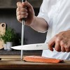 [This review was collected as part of a promotion.] This knife is amazing it’s sharp cut right through my watermelon with ease , it’s comfortable to hold very durable and the precision is spot on it came with a little cover for the tip and is safe !! Love this knife could use a whole set !!