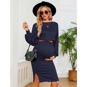 Maternity 2 Piece Outfits Dress Long Sleeve Ribbed Knit Top Bodycon Baby Shower Midi Skirt Sets - 1 of 4