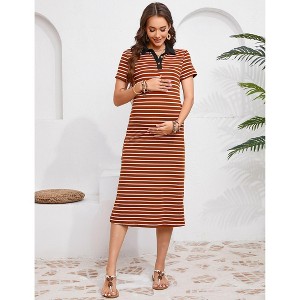 - The button collar adds a polished touch to this striped maternity dress, allowing you to adjust the neckline for a casual or slightly dressier look.