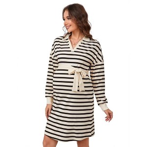 Maternity Sweater Dress Long Sleeve Collar V Neck Striped Midi Dress with Belt Baby Shower Photoshoot - 1 of 4