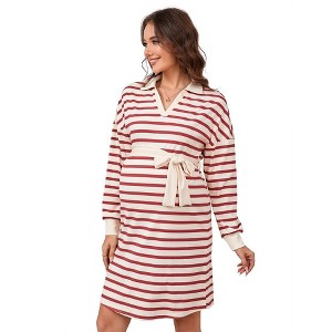 Maternity Sweater Dress Long Sleeve Collar V Neck Striped Midi Dress with Belt Baby Shower Photoshoot - 1 of 4