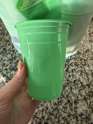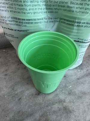 Great cups when try to be more responsibly disposable, but note that it says it is only commercially compostable. They were lighter green than I expected, but felt in all ways like a regular plastic cup. I would definitely buy these again.