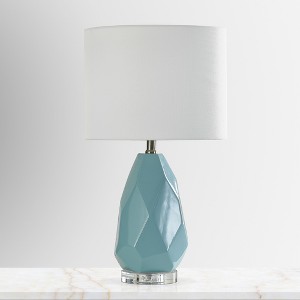 Maxax Blue Geometric Ceramic Table Lamp,Elegent Desk Lamp with Linen Shade for Bedroom Nightstand/Living Room