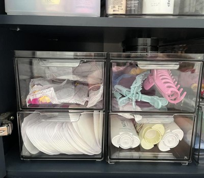 - SIMPLE STORAGE: Stackable design maximizes space; Pull-out drawer makes it simple to grab what you need; Transparent construction lets you see what's inside, so you can find what you are looking for